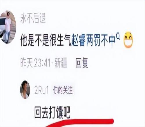 当然除了这条之外,赵睿还出现了其他回复。就比如赵睿两次罚球没有打进,赵睿直接回怼:回去打馕吧。因为那两个球如果赵睿打进的话,球队就可以追平了。可惜的是,赵睿却错失了。赵睿肯定也非常懊恼,所以在情绪不当的情况下,他也回怼了过去。