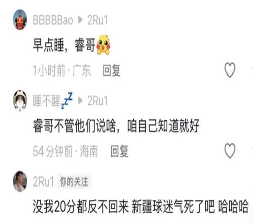 此外还有一条:没我20分都反不回来新疆球迷气死了吧哈哈哈。毕竟在球队大部分落后的时候,就是靠着赵睿在进攻端的串联扳回比分,这是大家都看在眼里的。也希望这次之后赵睿少被球迷的言论影响吧,确实有点败好感。